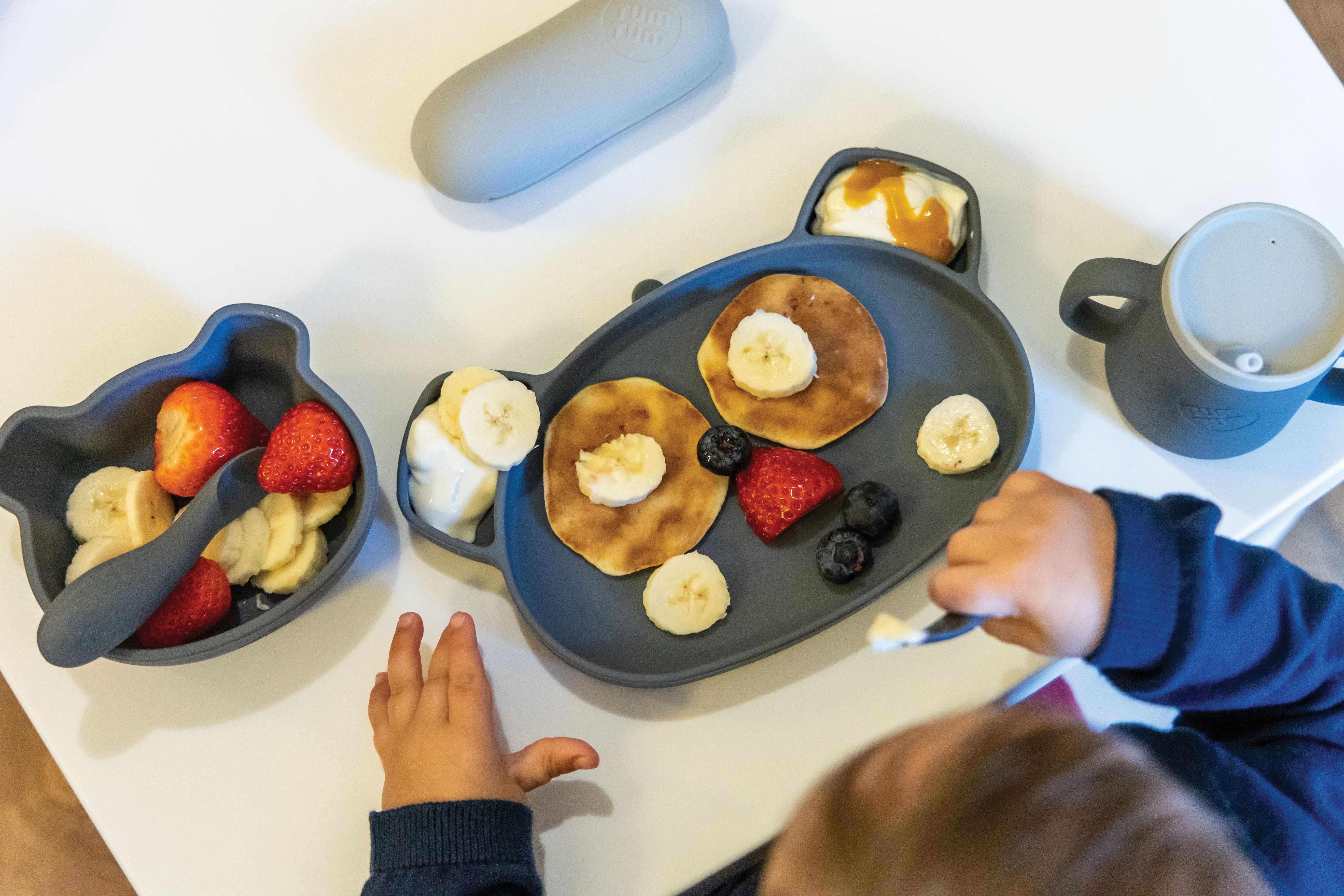 是的,是汲取自我們的育兒經驗,因為有個挑剔的小孩一開始只吃米和泥狀物(笑),當時也尋求了很多建議,學習到很多招數,讓進食這件事變得有趣,而且我們也不會因此倍感壓力。這也許是對正在嬰兒餵食期的父母一個很重要的建議:當孩子正在學吃飯,試著讓自己放鬆一些,即使他們對你做的餐點不領情。孩子就像是小海綿,他們會觀察妳,和他們一起坐、一起吃,用希望孩子使用餐具的方式吃飯、喝水。如果看到你很放鬆、享受,他們也會模仿。