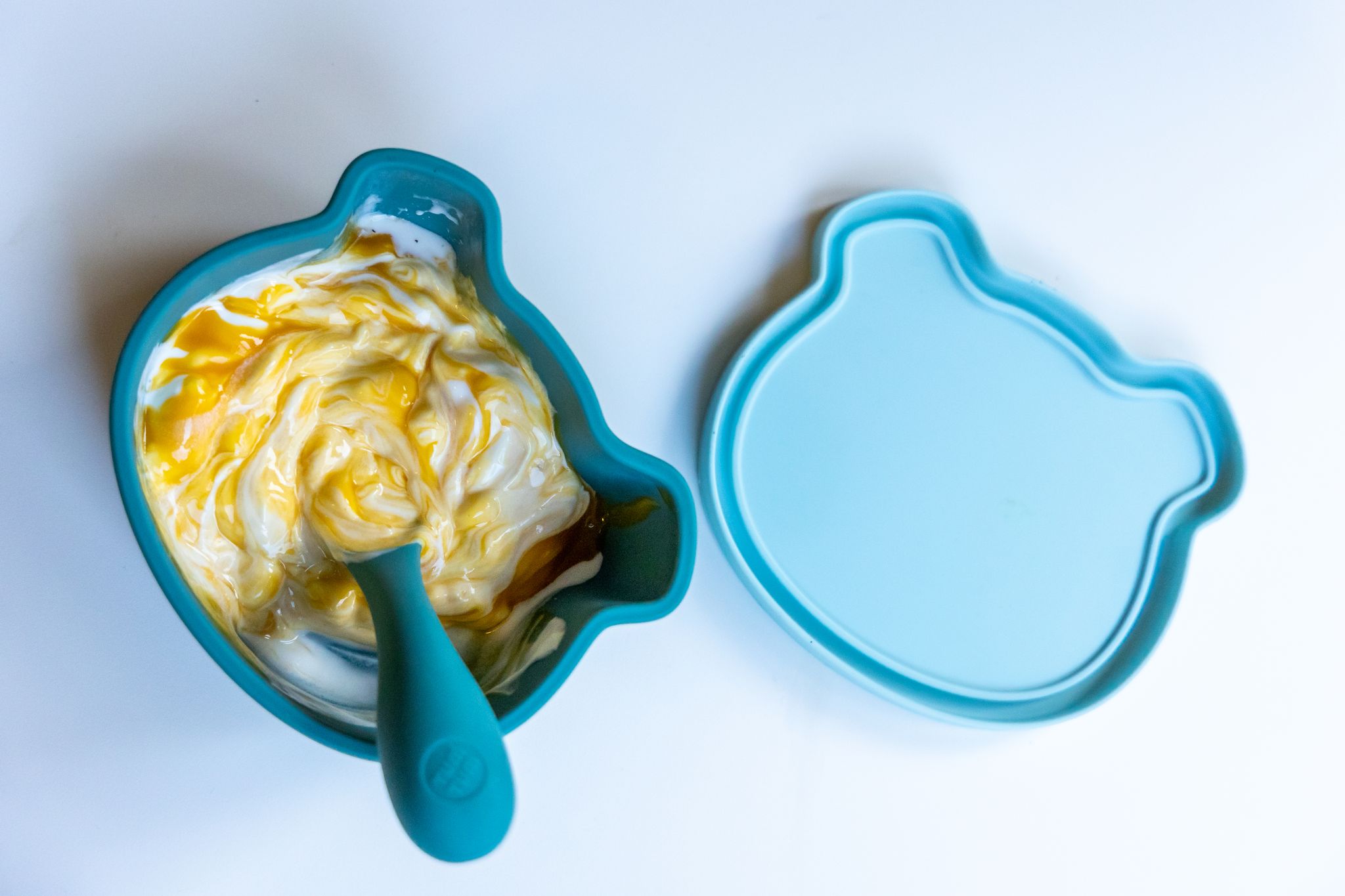 餐碗它底部是吸盤設計,吸力很強,我們把它放在許多不同表面測試過,碗壁的傾斜度可以輔助寶寶輕鬆舀起餐食。所以當孩子用湯匙在餐碗舀取食物時,吸盤讓餐碗牢牢固定在桌上,但要先確認桌子表面是乾淨無孔洞的。餐碗也有附上蓋,外出方便裝零食攜帶,也方便儲藏食物放入冰箱。