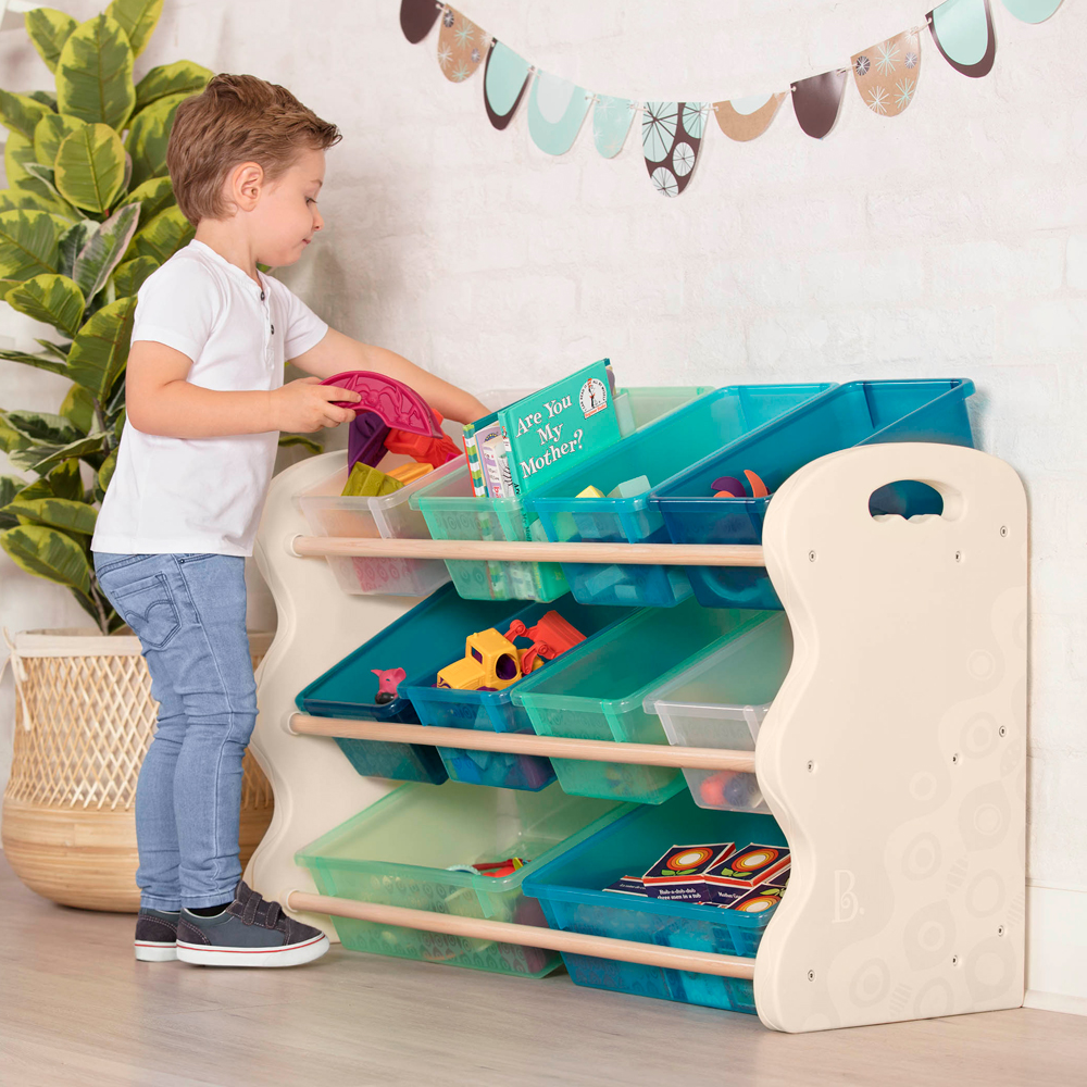 家中如有年齡較大的幼童,不想在半夜餵奶時被散落一地的玩具絆倒,開放式的玩具收納架除了可以分類玩具、一目瞭然,也能引導幫助孩子養成收納習慣。