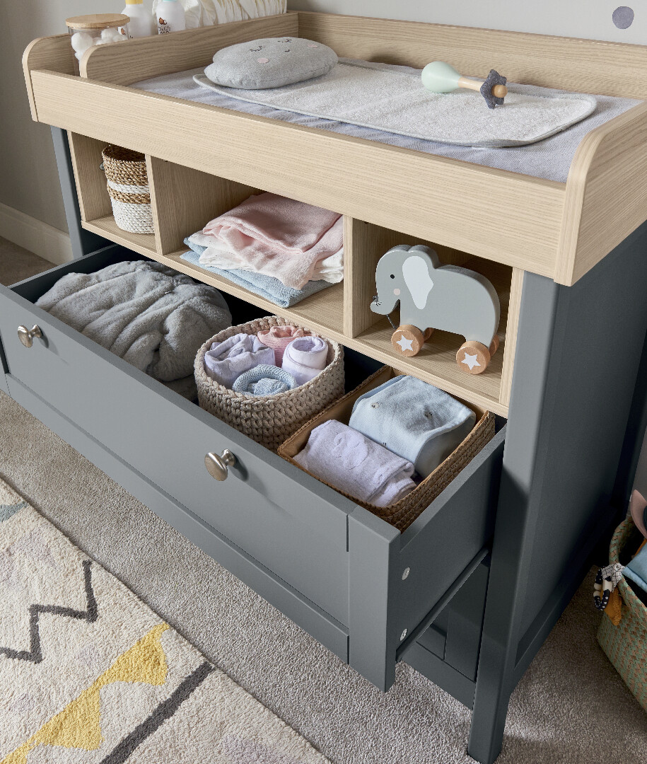 嬰兒還沒到來之前,我們會想像他在嬰兒床裡微笑或安睡的樣子,但現實生活中難免會遇到突發狀況,吐奶、溢奶、剛換尿布就炸屎,或是突然不明原因的哭個不停。當你一打一,雙手又無法離開寶寶的時候,如果還要花時間翻找只會更慌亂,所以規劃嬰兒房時,尿布、衛生紙、濕紙巾、紗布巾、拍嗝巾、安撫奶嘴、爽身粉、嬰兒油、汙衣籃…等,這些重要支援物品都要擺在觸手可及的範圍。