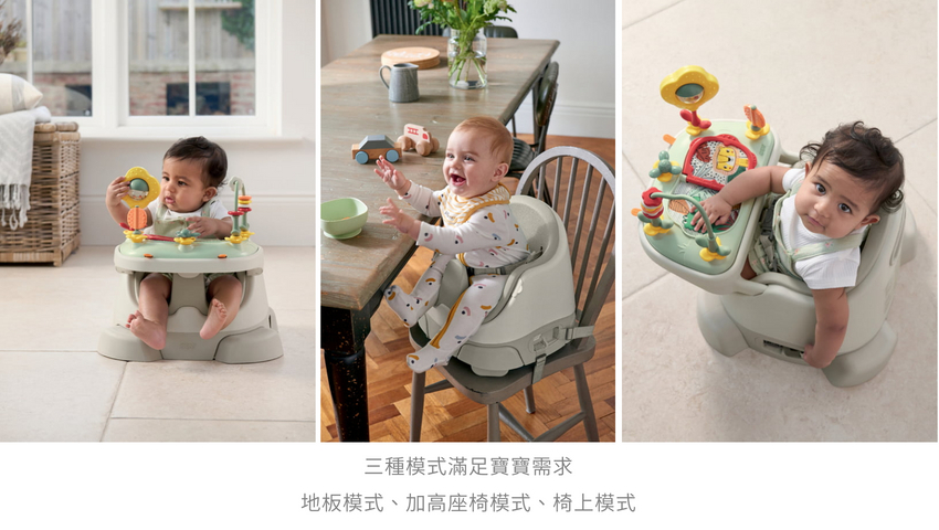 這時期寶寶剛開始練習坐,需要的是一張安全、包覆性高的養成椅。像下圖中的這幾張,下方可展開支撐腳,放在地板上也能穩穩學坐,搭配玩具盤還能訓練抓握與專注力。